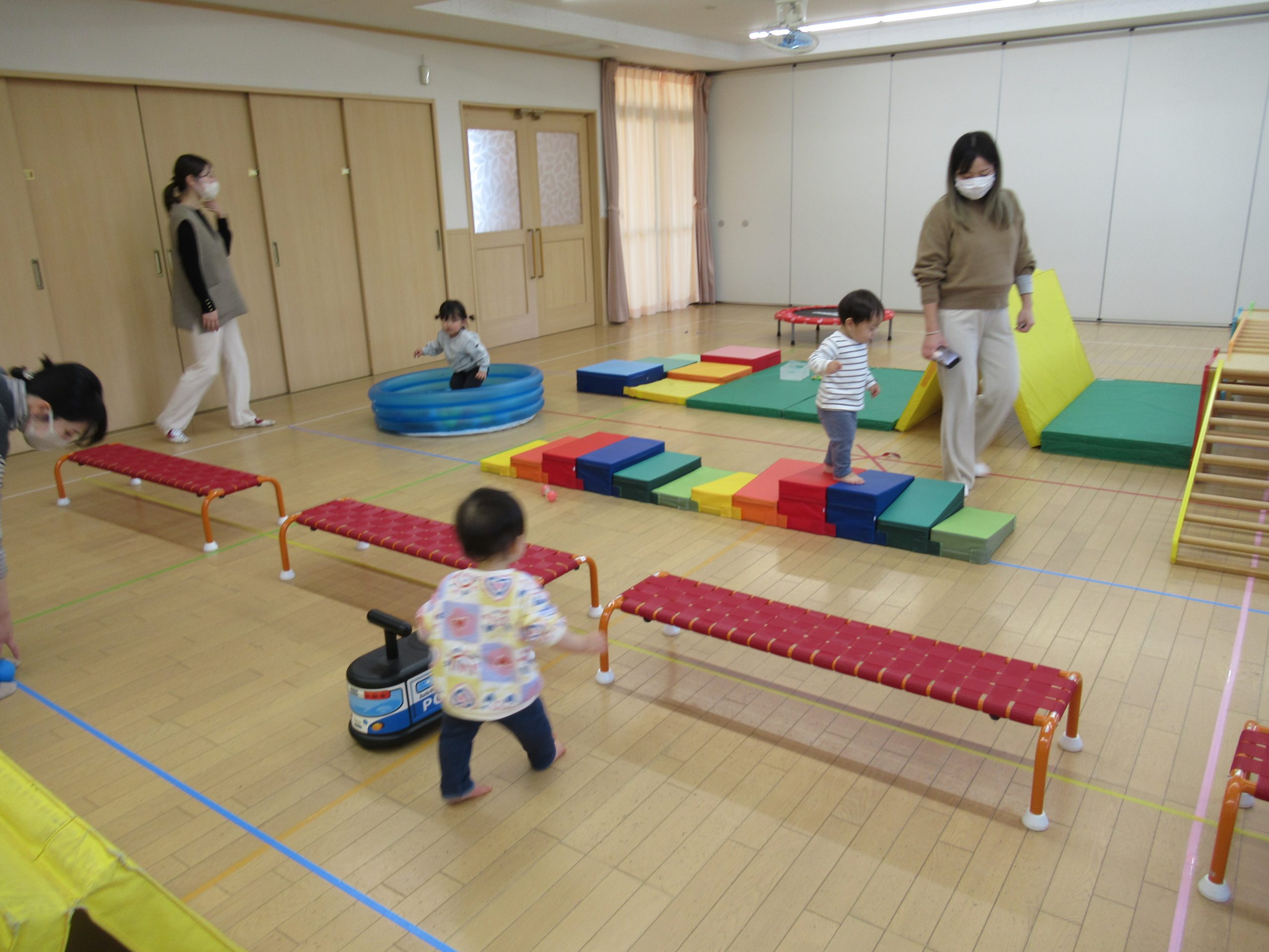 入園する前のこどもと母親が、一緒に遊びながら親子の絆を深めるとともに、子育ての喜びや悩みを語り合える場、また仲間作りの場を提供しています。年間を通して、歌・制作・誕生会・身体測定・などの活動を行っています。また、夏まつりごっこや運動会ごっこ・クリスマス会など季節行事も多数計画しています。