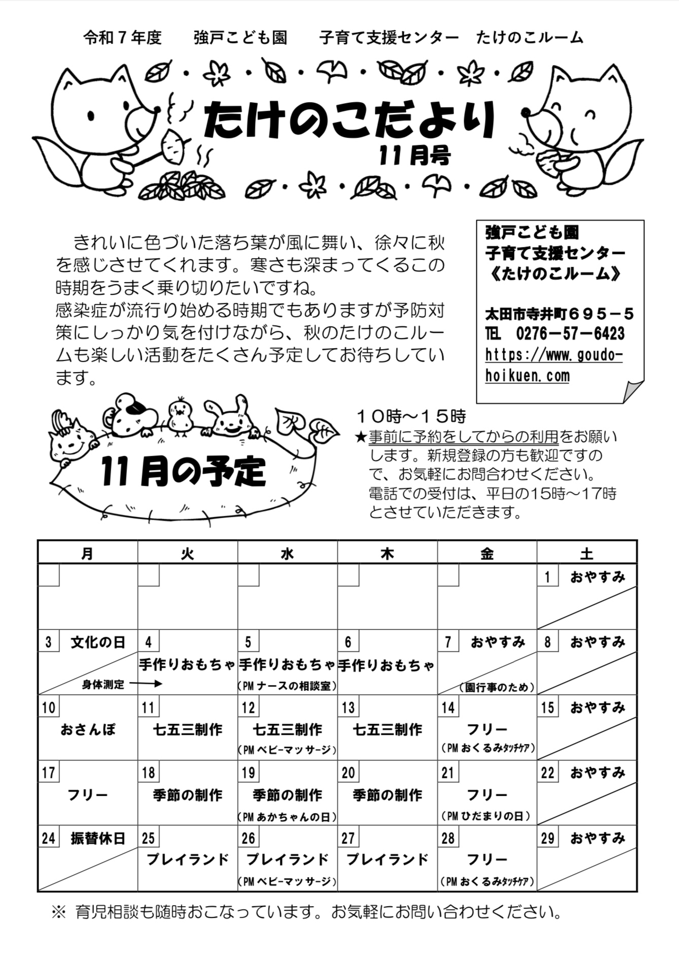 ※新規で利用希望の方は、『たけのこルーム』のご案内」をご覧になってから、電話(平日15:00~17:00)かメールでお問い合わせください。
