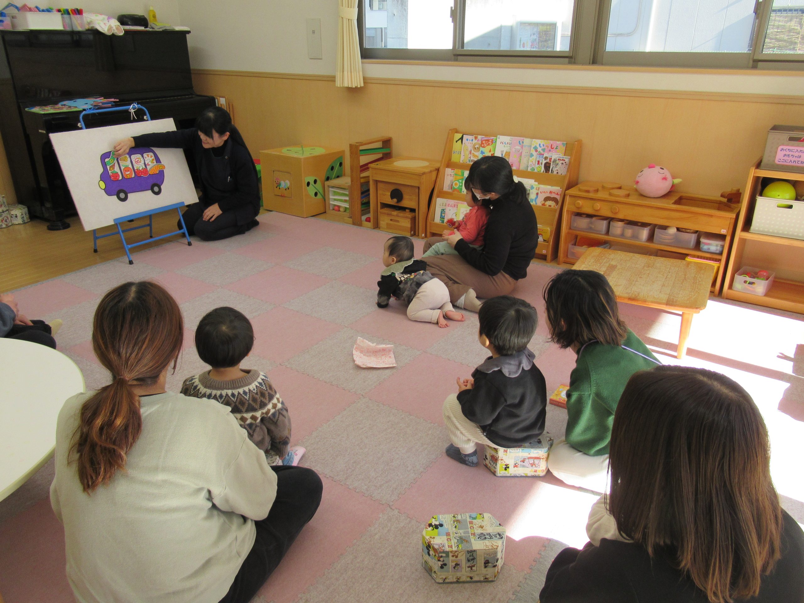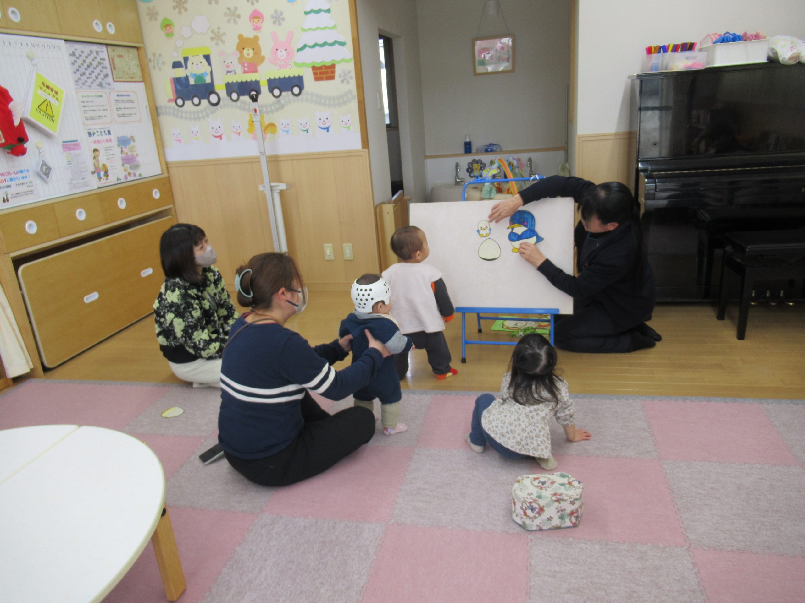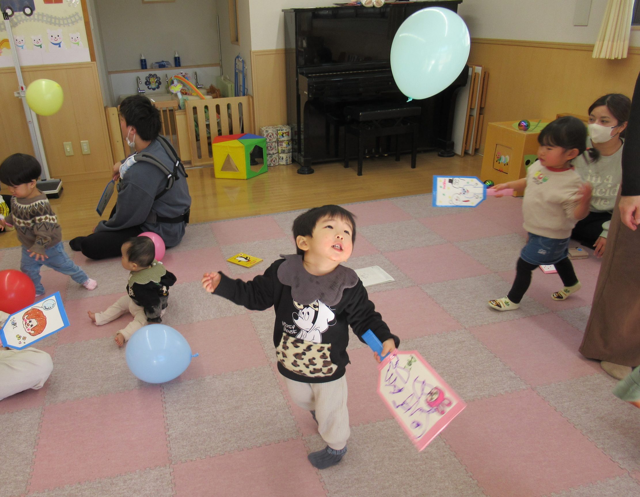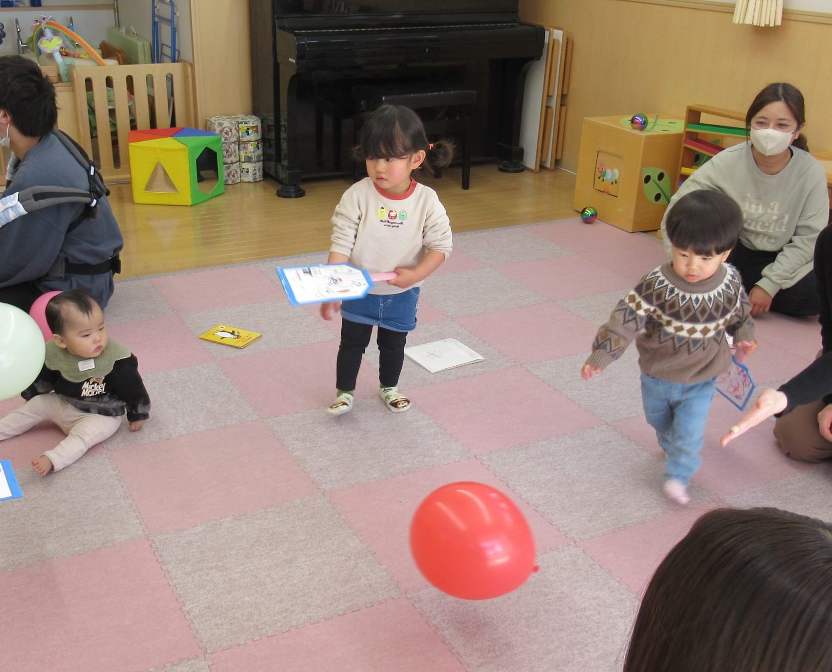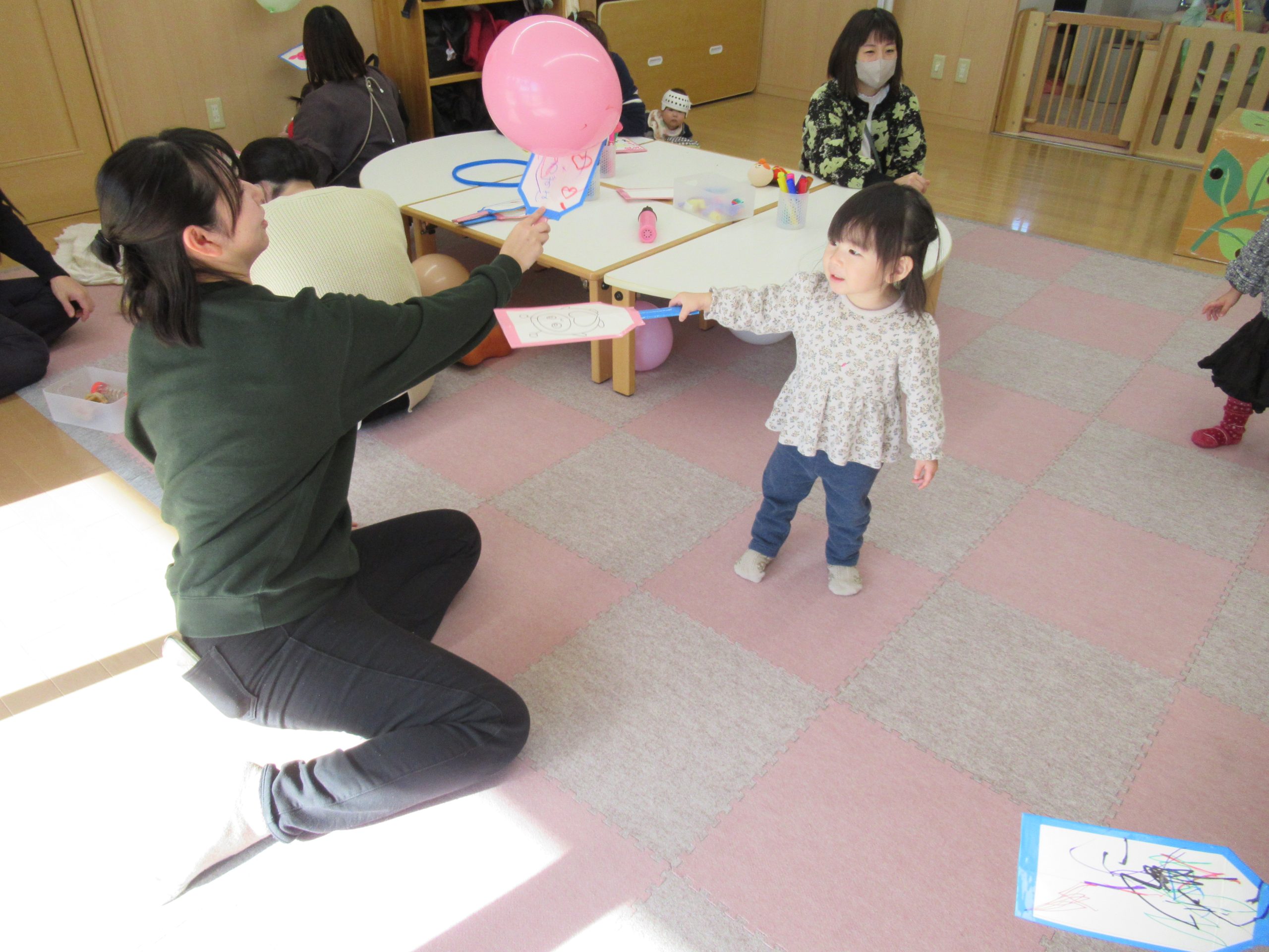 新年最初の活動は、ふれあい遊びと牛乳パックで作った羽子板で風船遊びをしました。