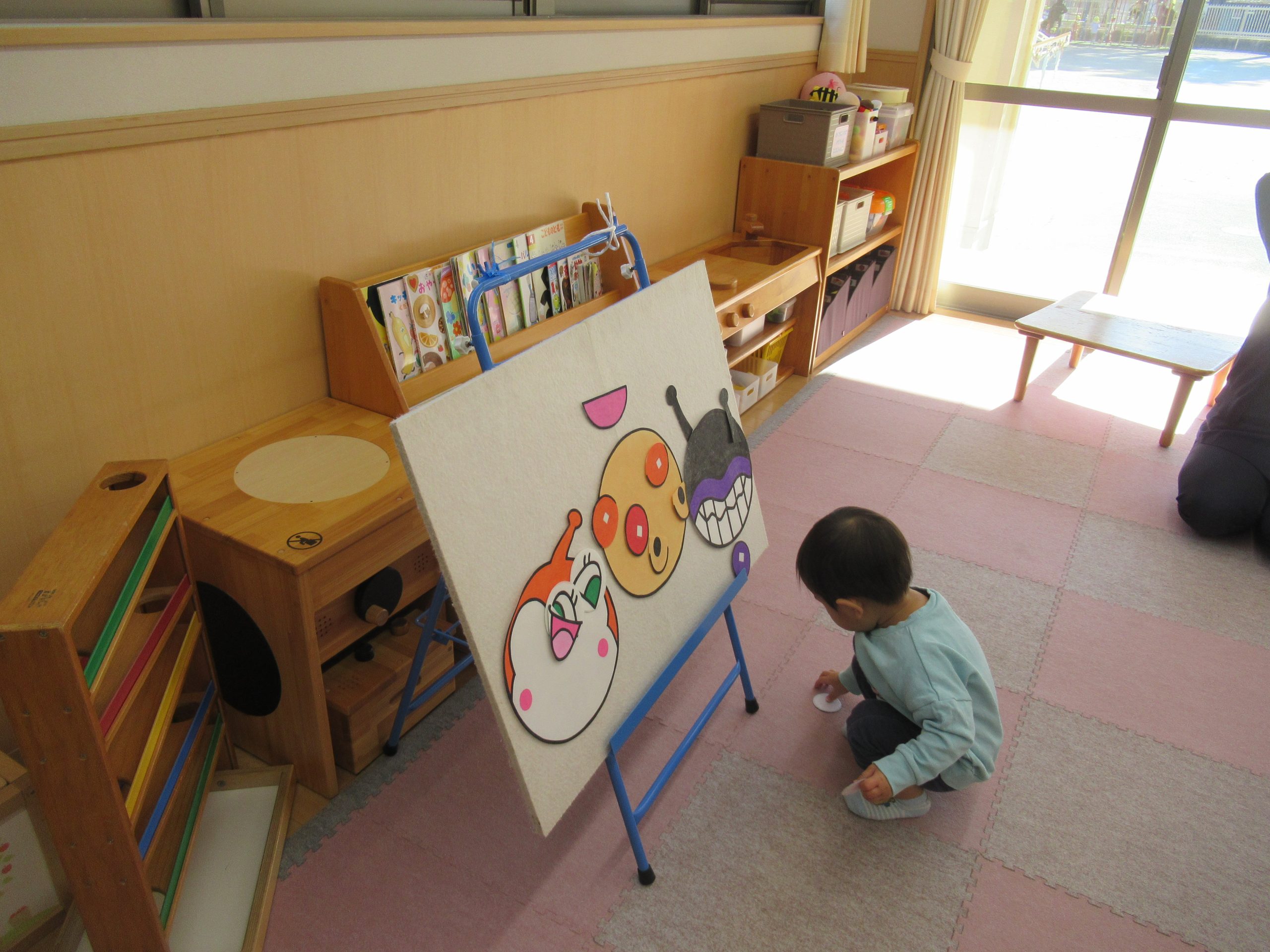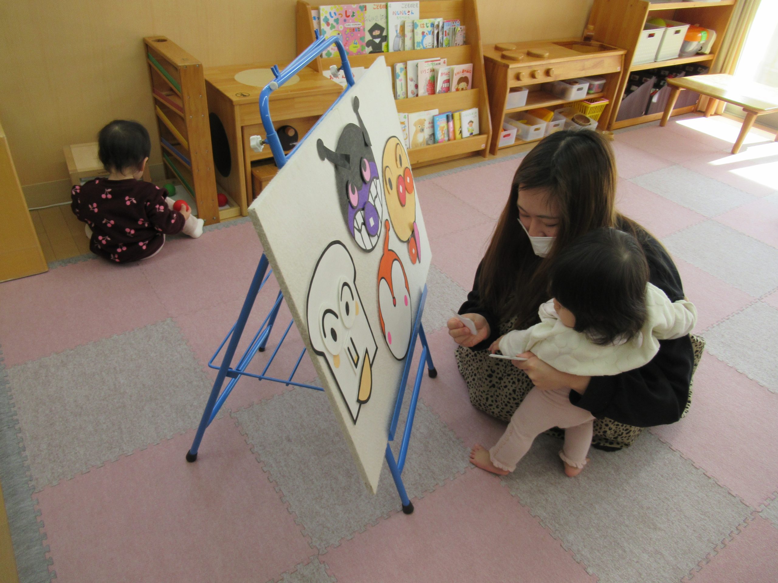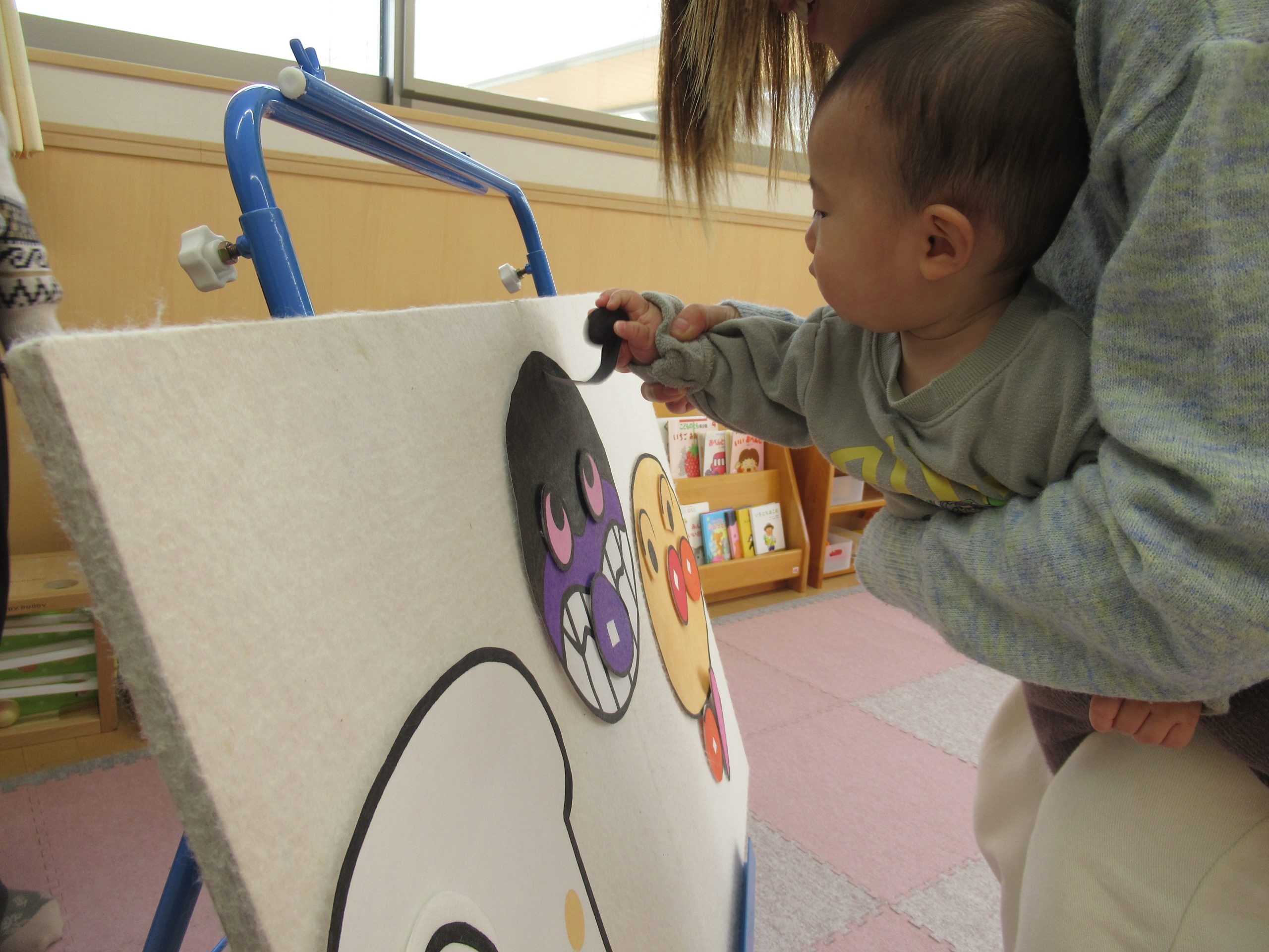 アンパンマンのカルタやパネルシアターのアンパンマン福笑いをしました。