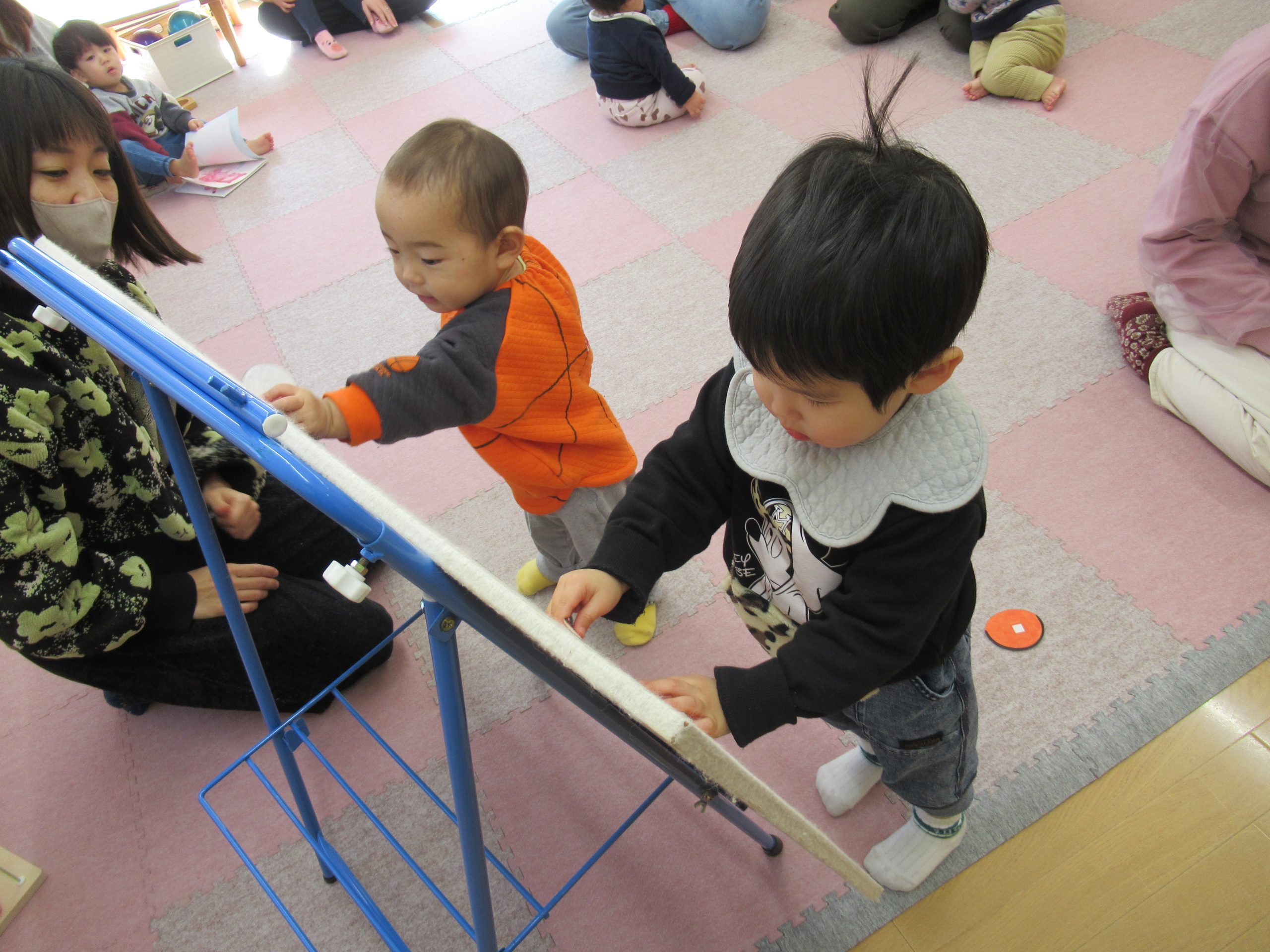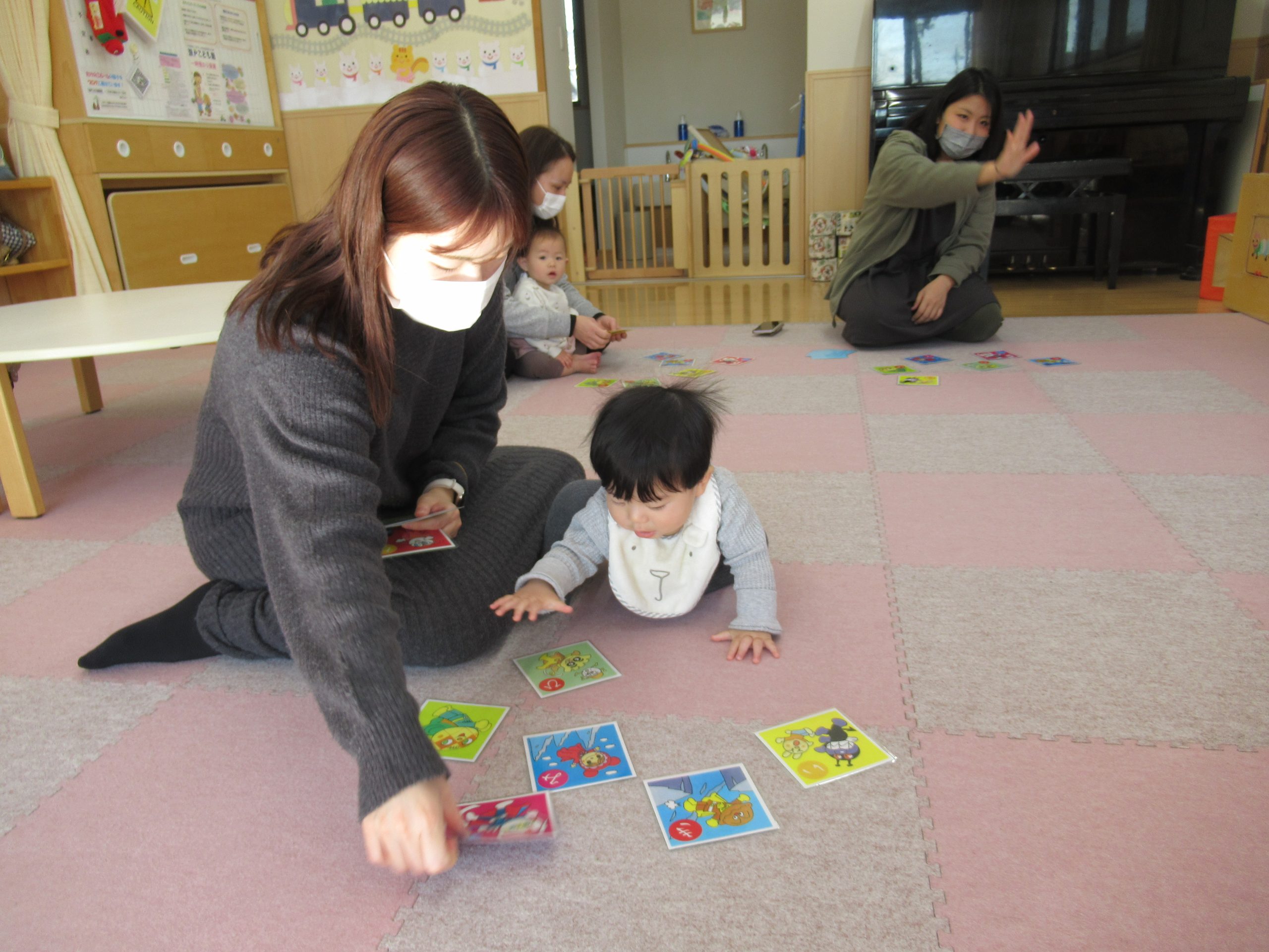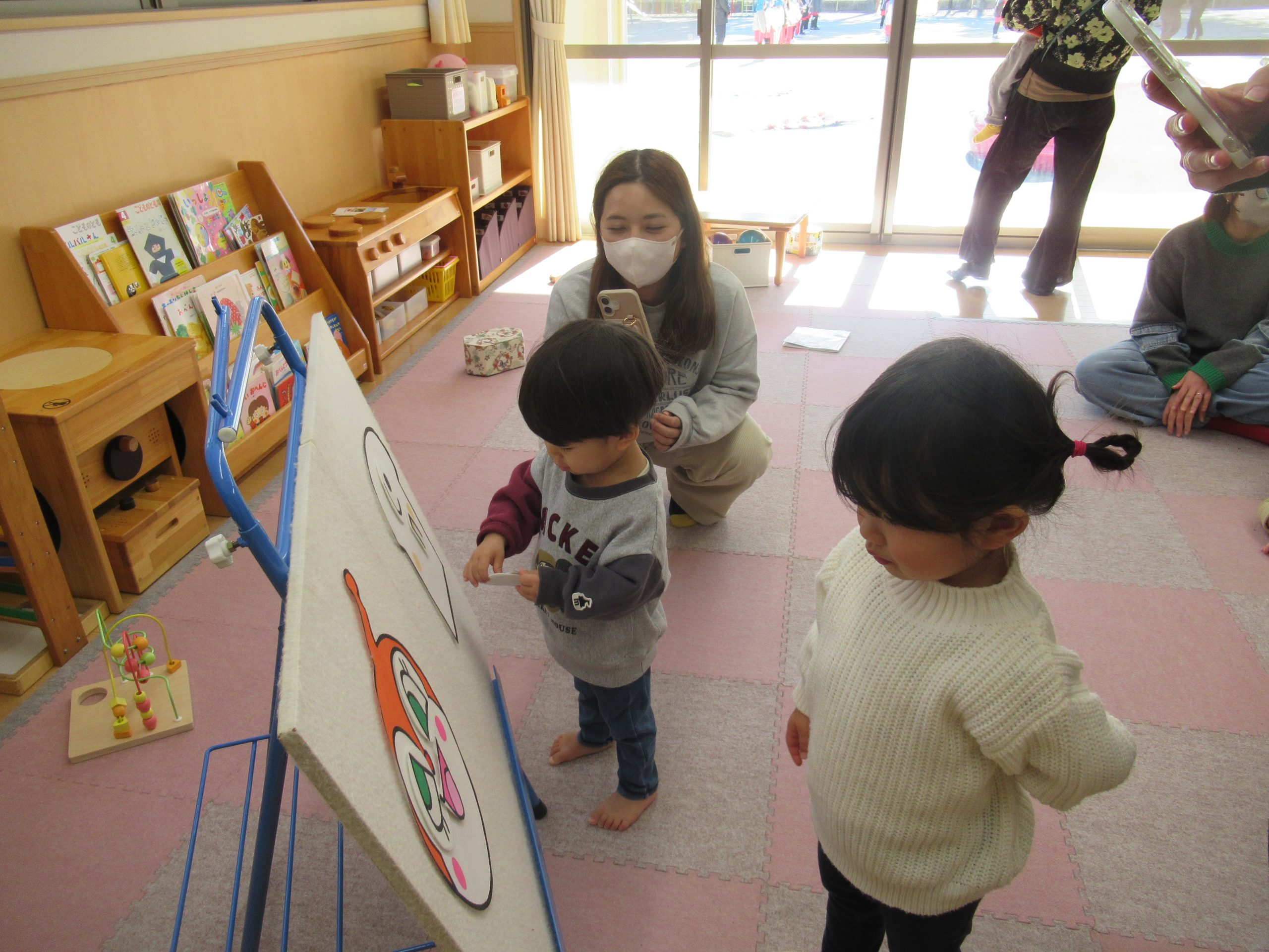 アンパンマンのカルタやパネルシアターのアンパンマン福笑いをしました。