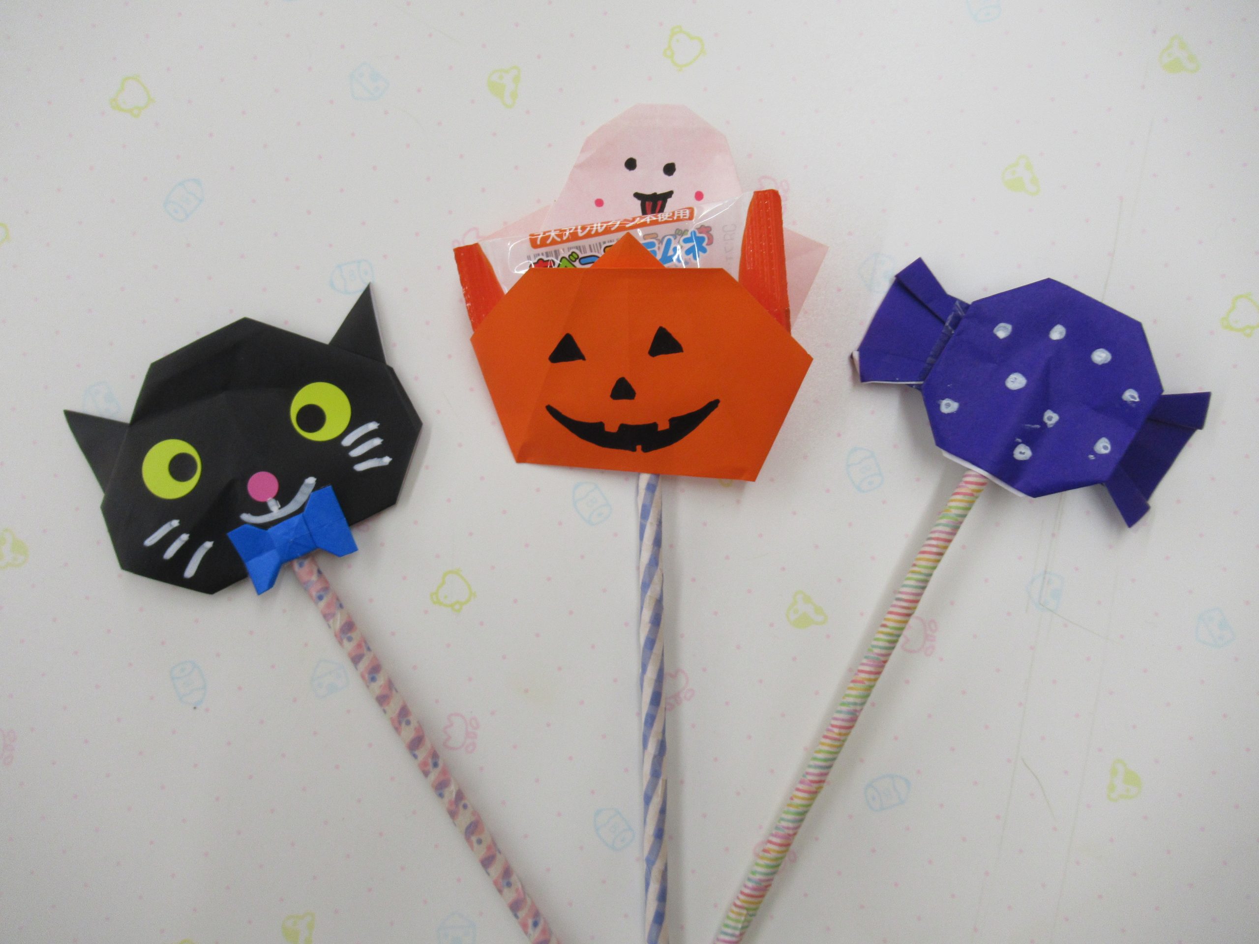 10月の季節の制作は、折り紙で黒猫とかぼちゃ&おばけを 作りストローに…