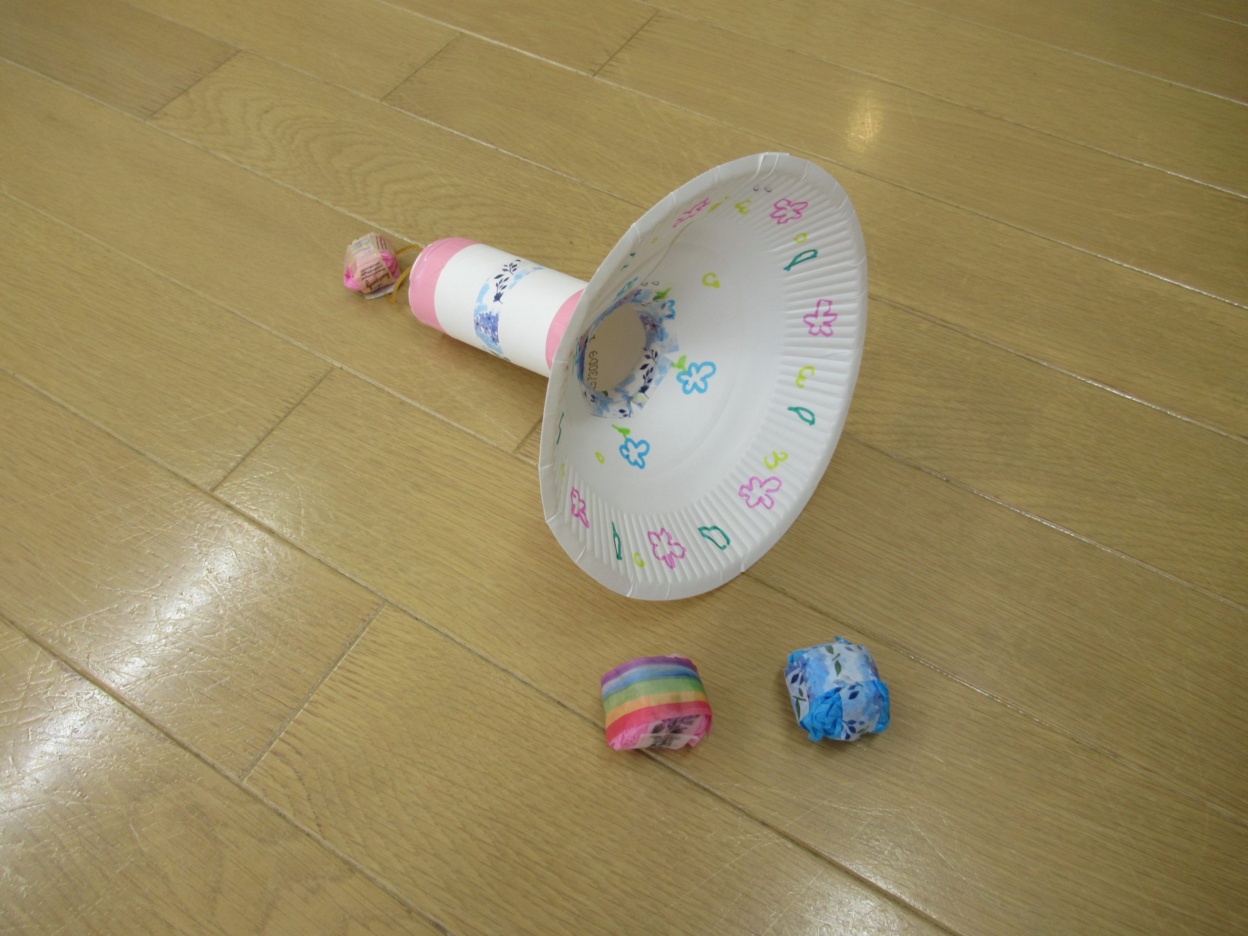トイレットペーパーの芯と紙皿、お花紙などを使ってボールが飛び出すおもち…