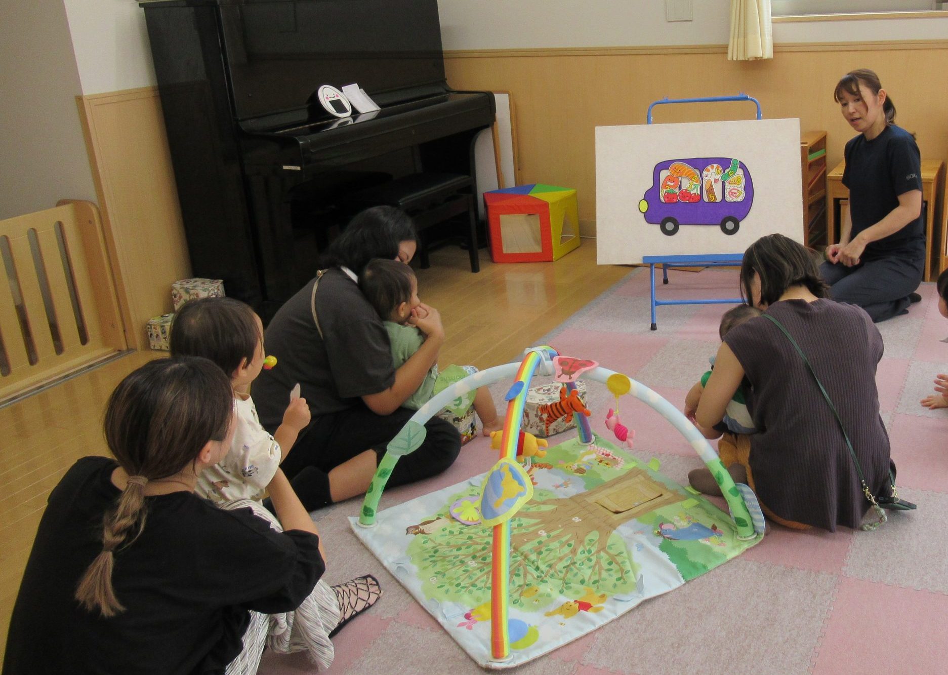 パネルシアターや手遊びをして、ママとのふれあいを楽しみました。