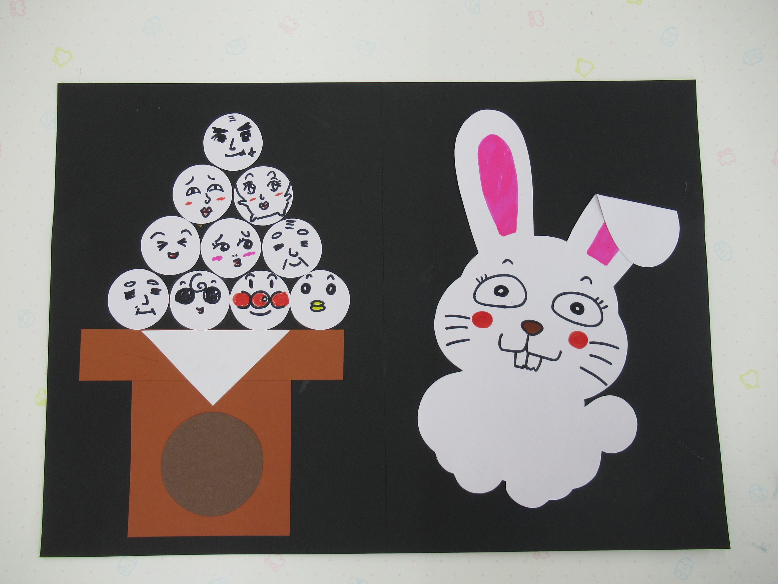 十五夜にちなんでお団子とうさぎの壁面制作をしました。 作品を飾って、お…