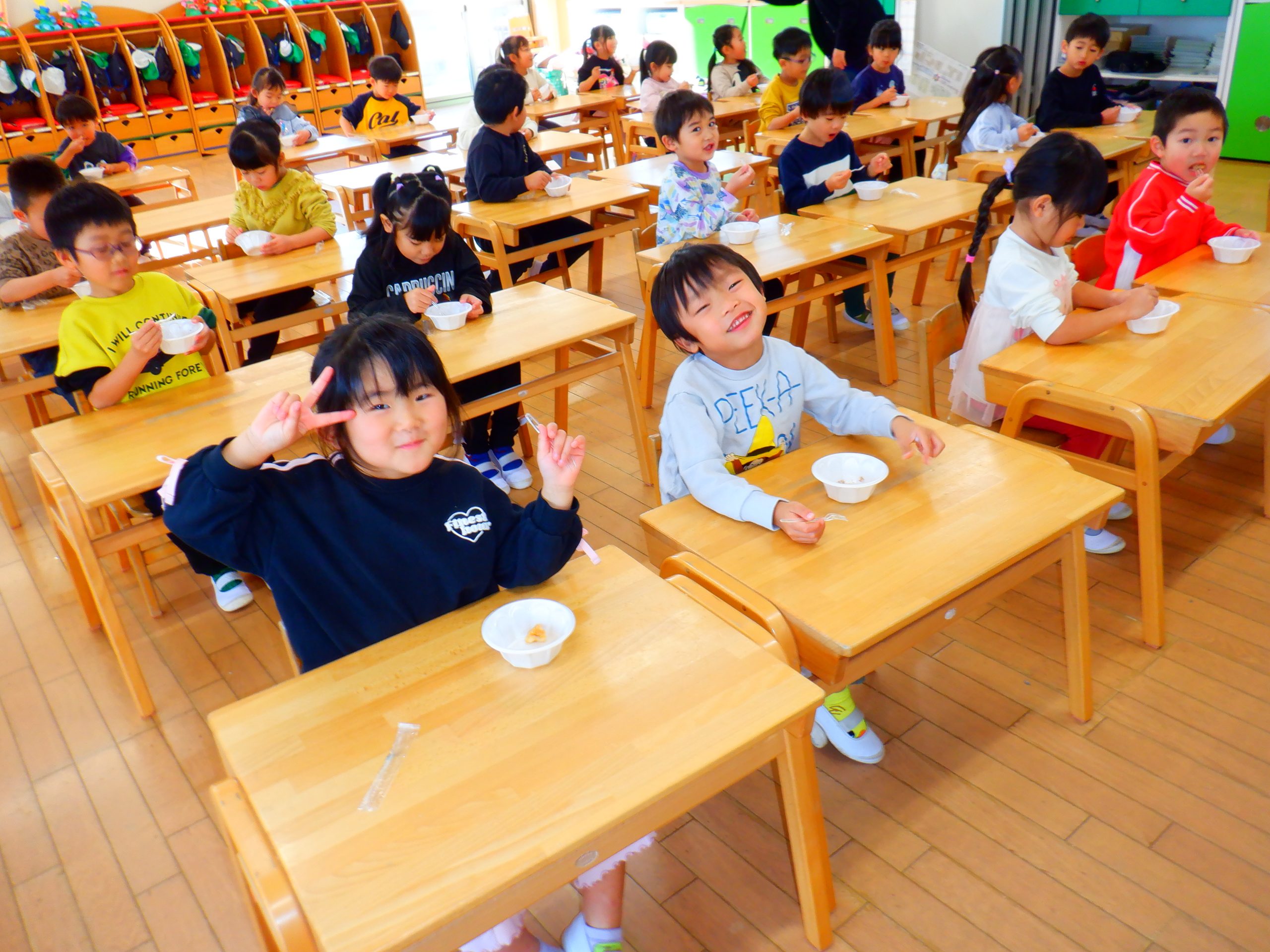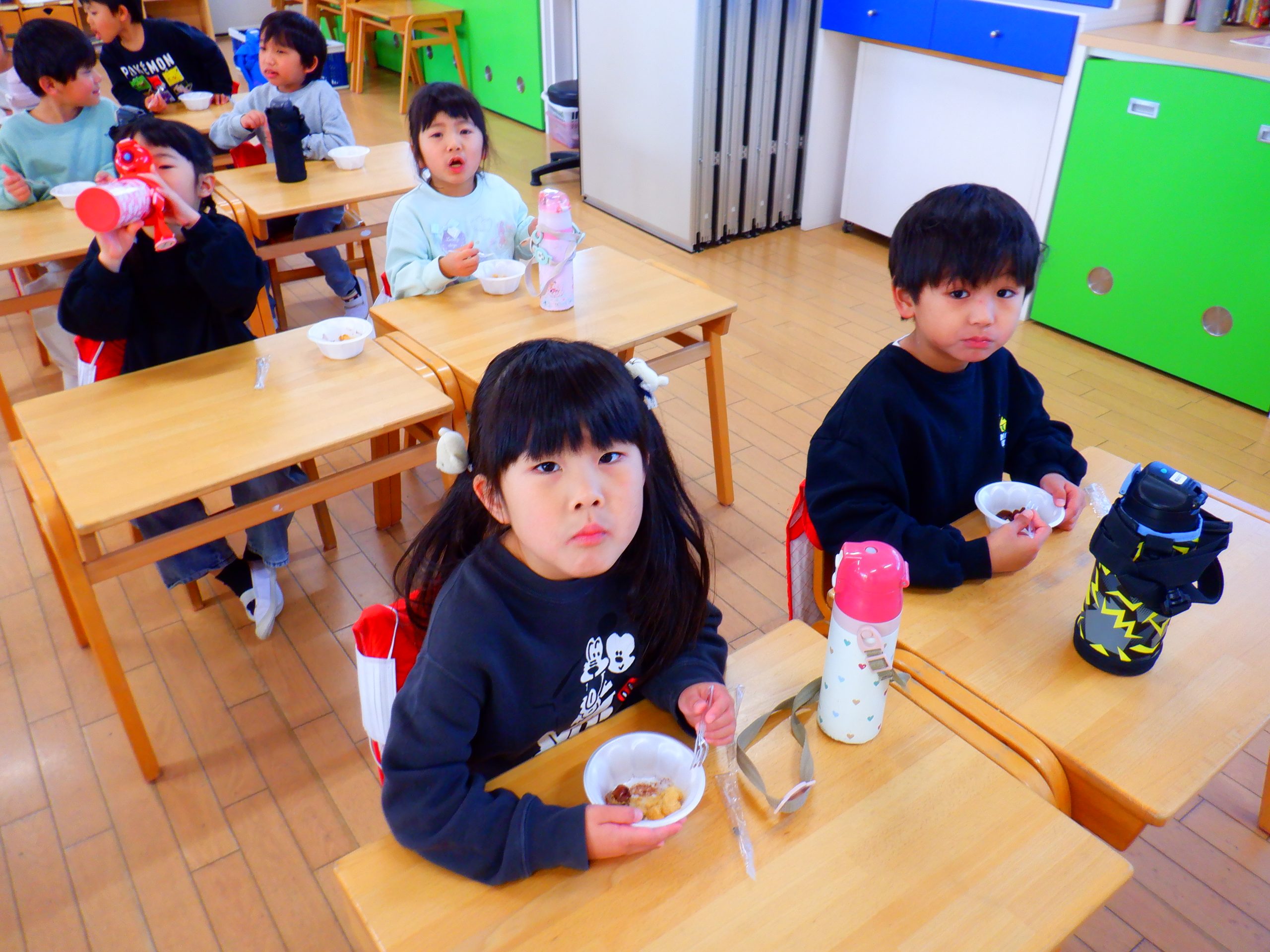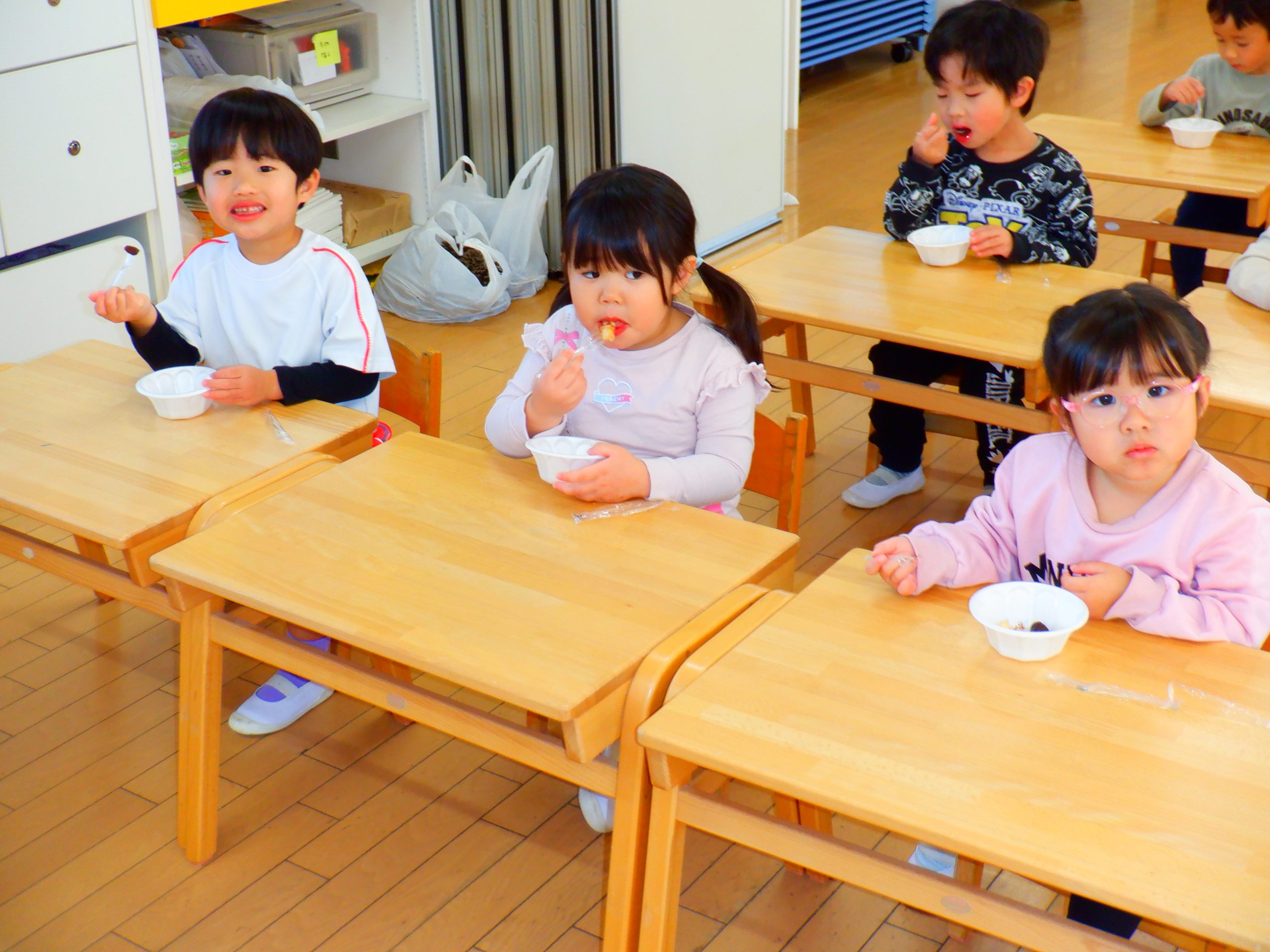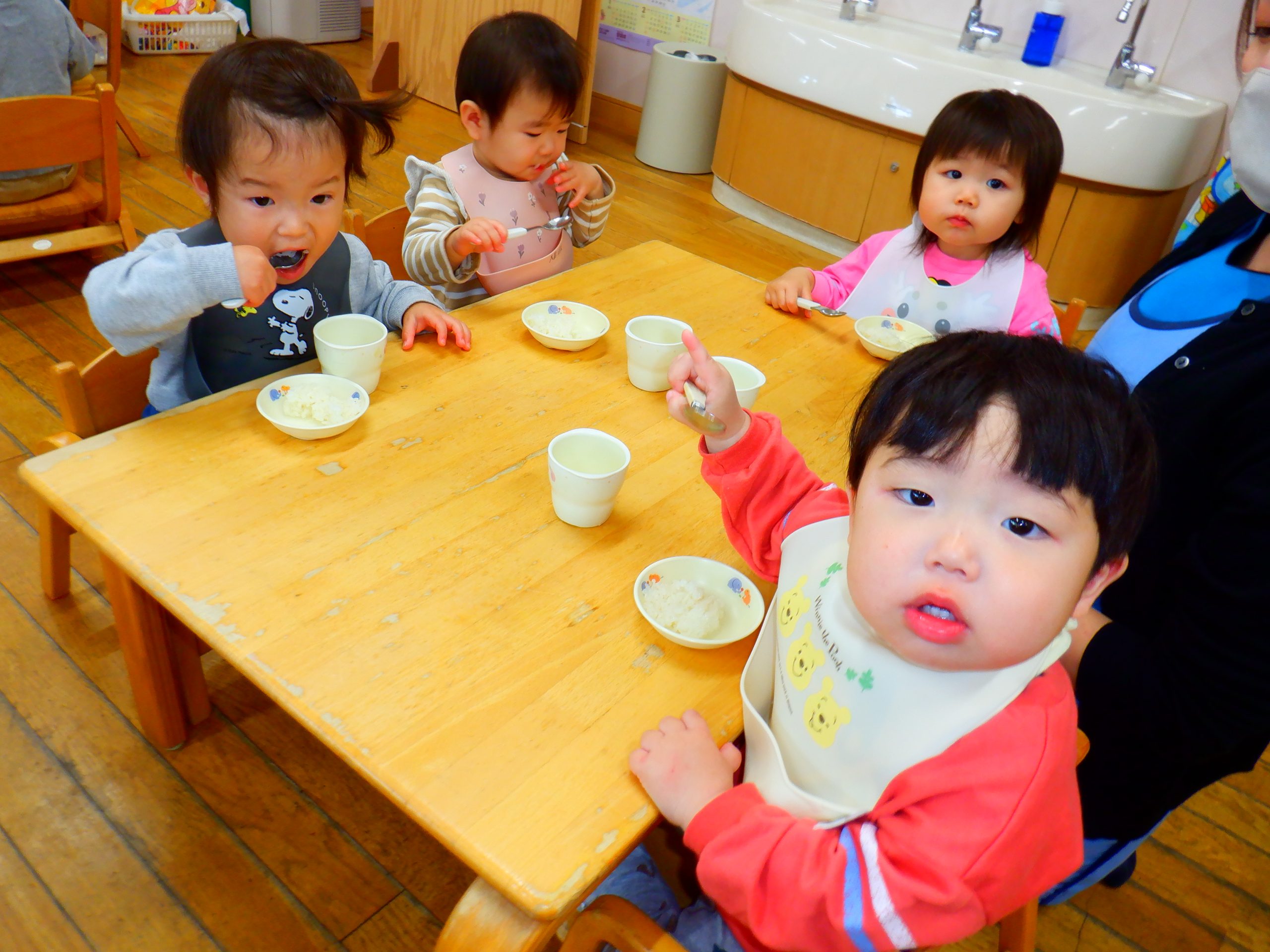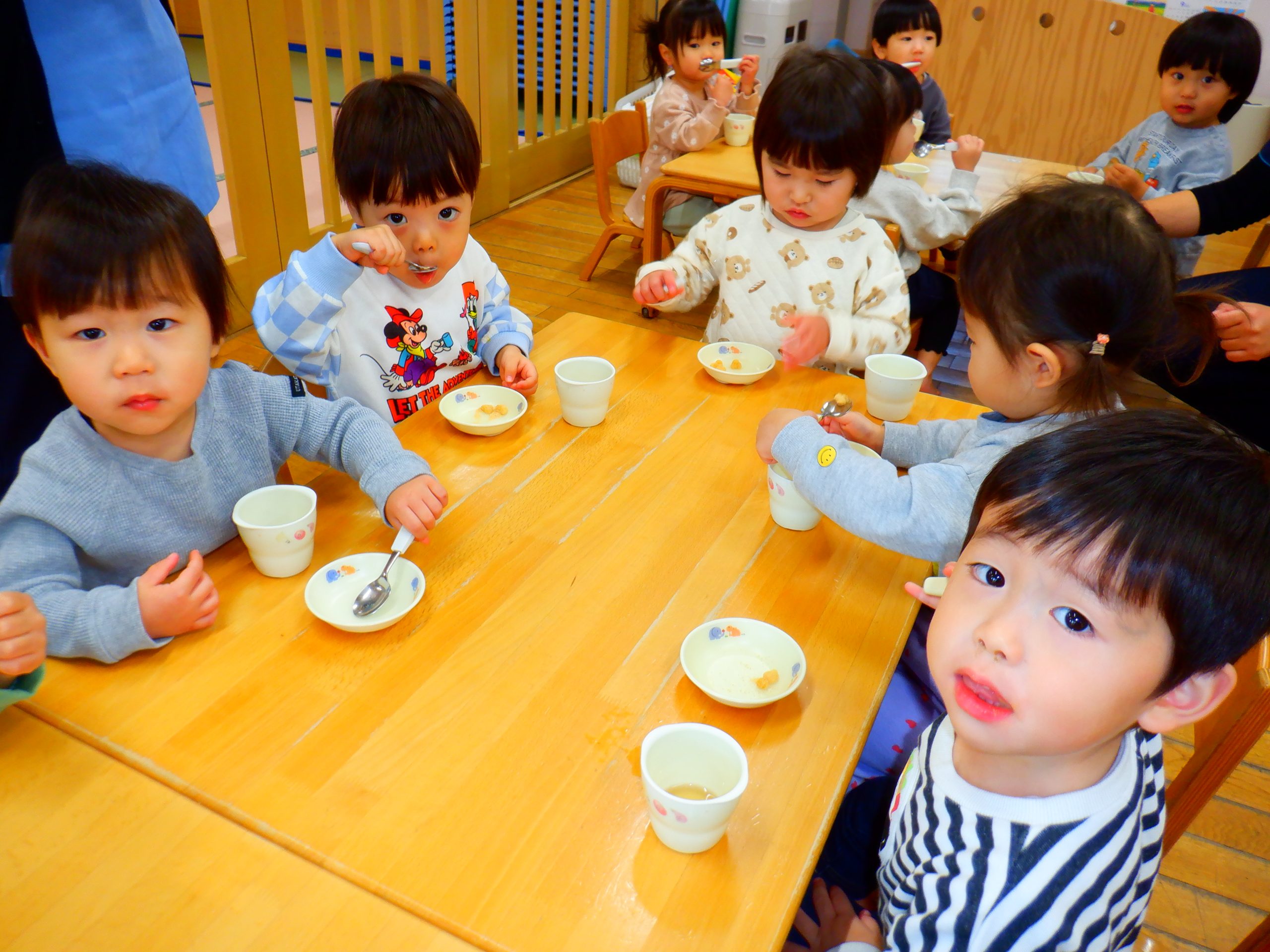 今日は、おもちつきをしました。0歳児は蒸したもち米をいただきました。1歳児も小さく小さくしたきなこのお餅をいただきました。