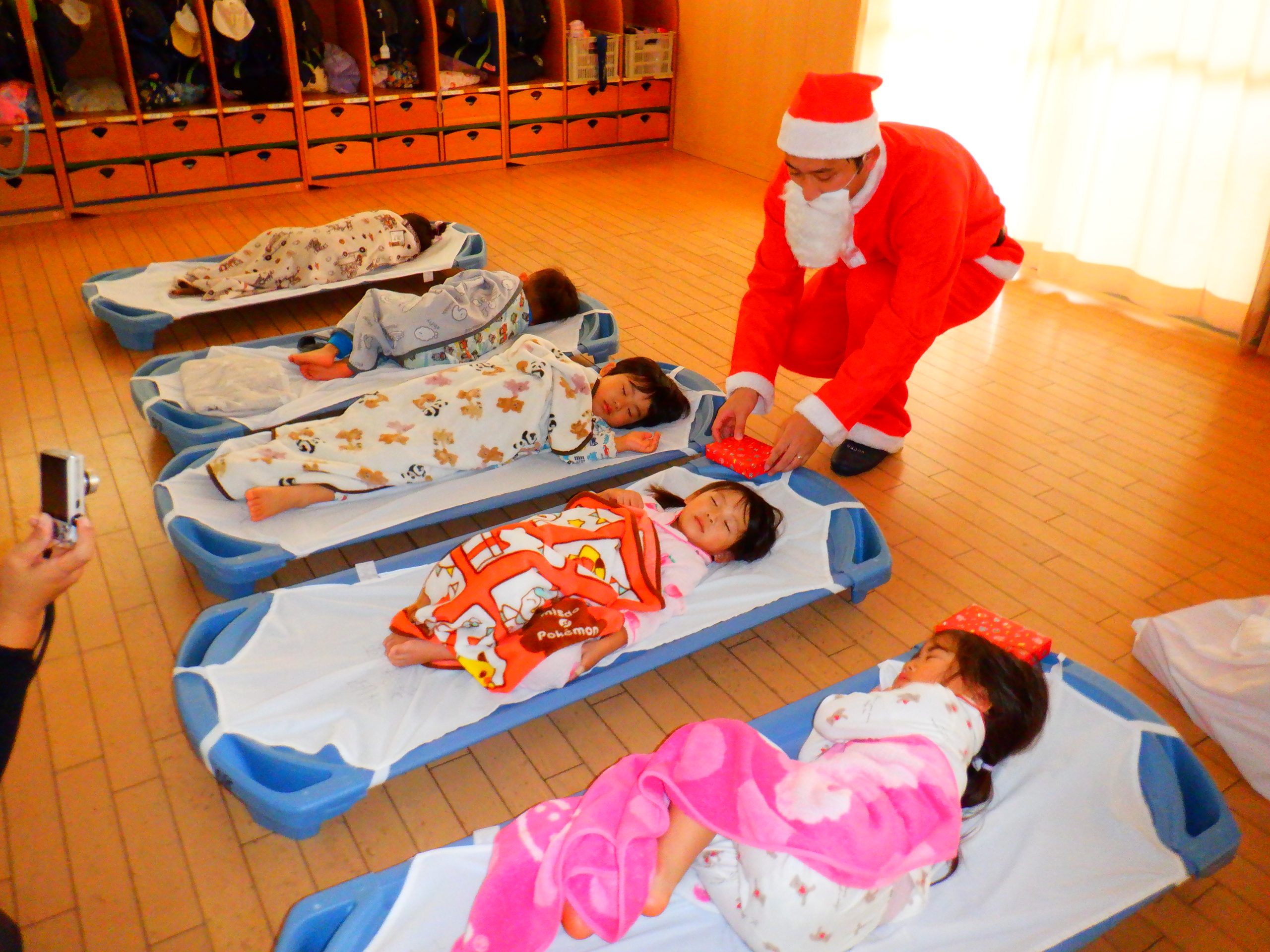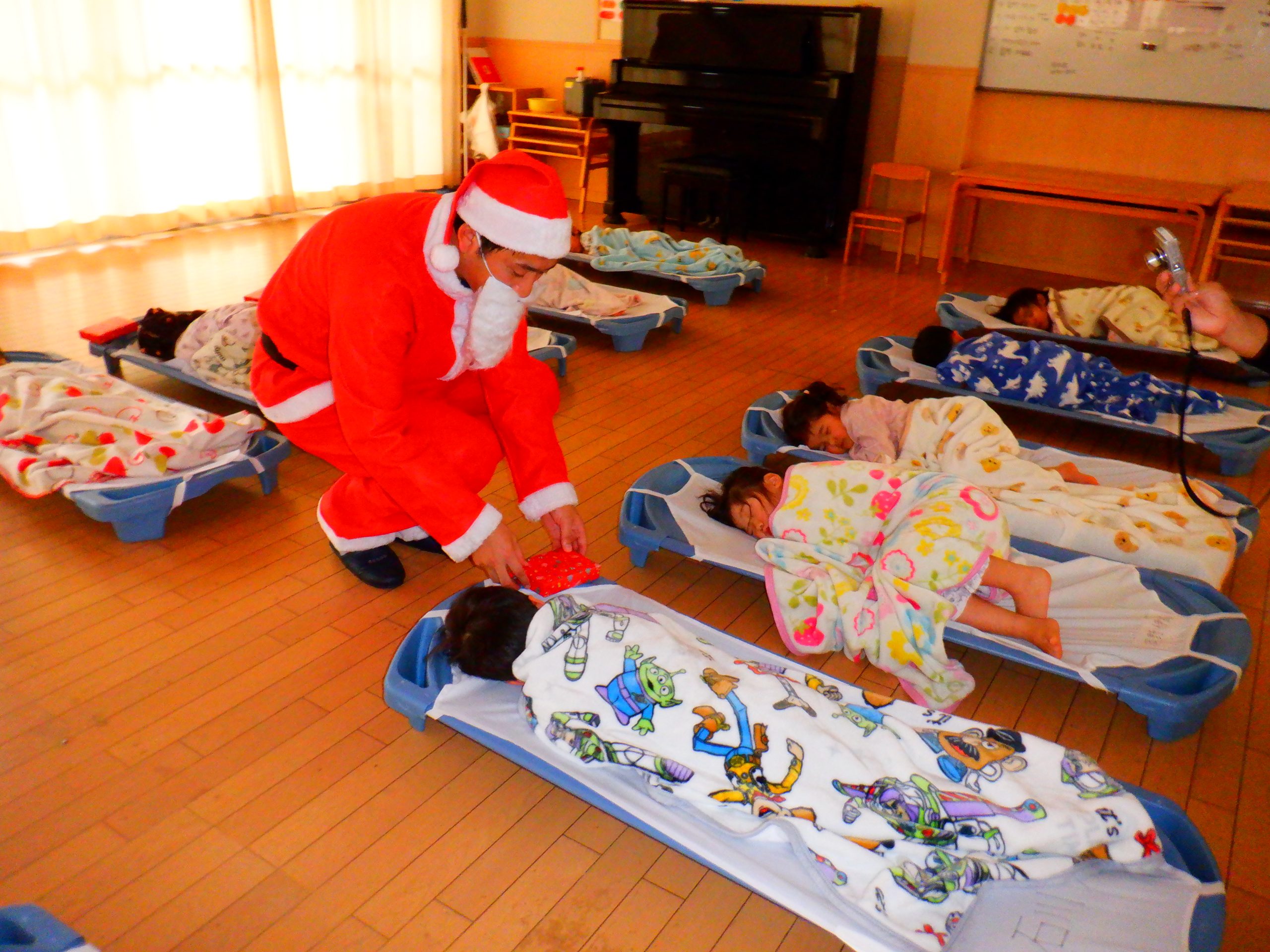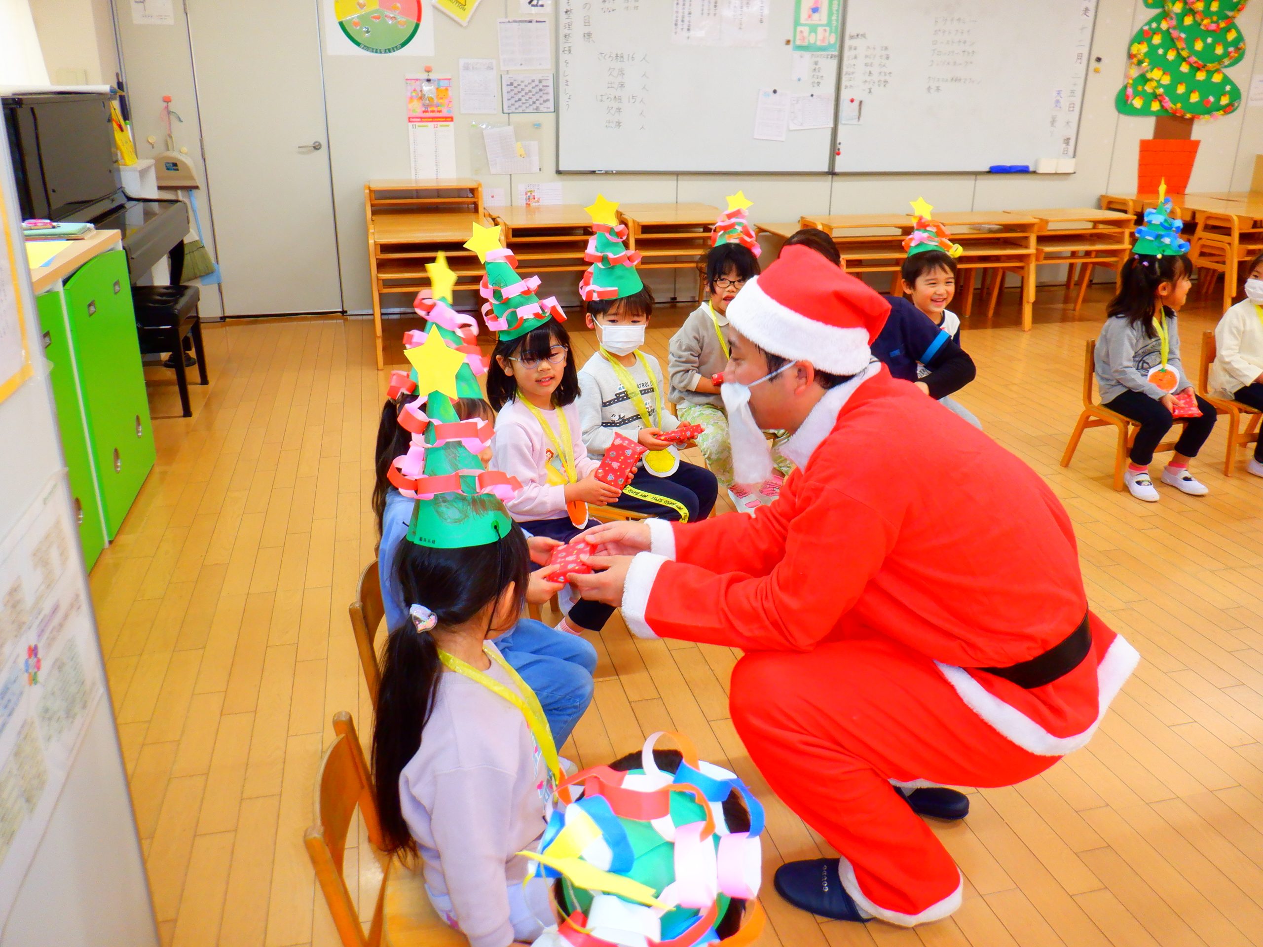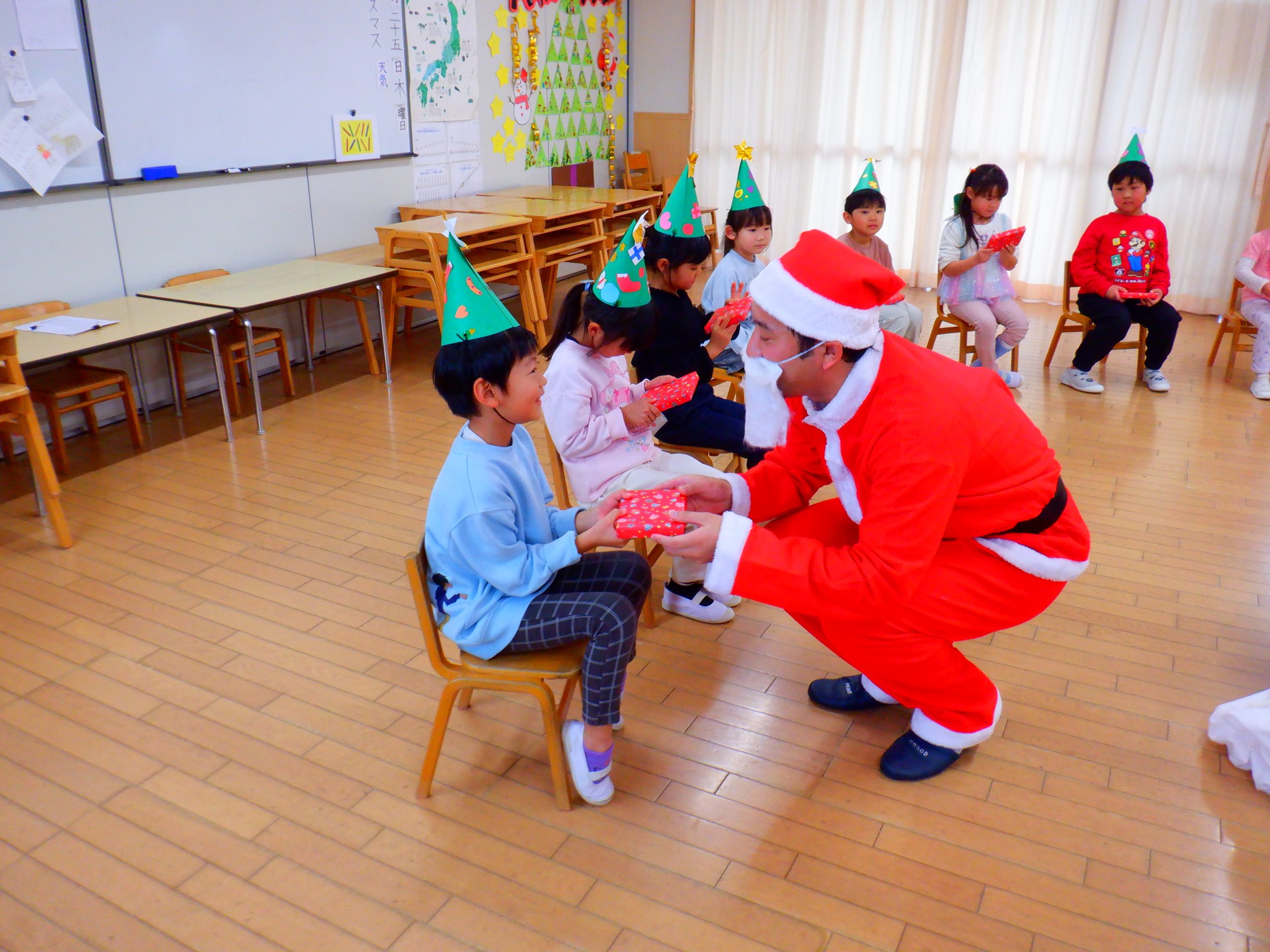 今日は、みんなの楽しみにしていたクリスマス会を行いました。学童さんのダンスや先生のハンドベルなど楽しい催し物の後は、サンタさんからプレゼントをもらいました。
