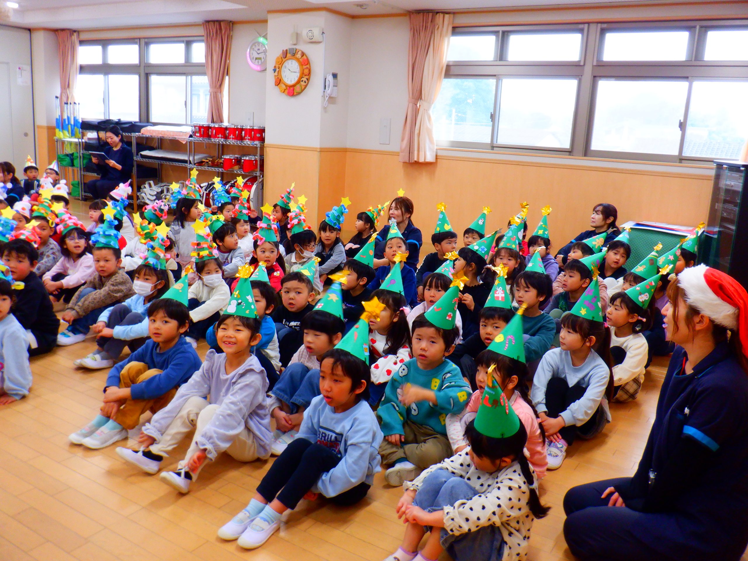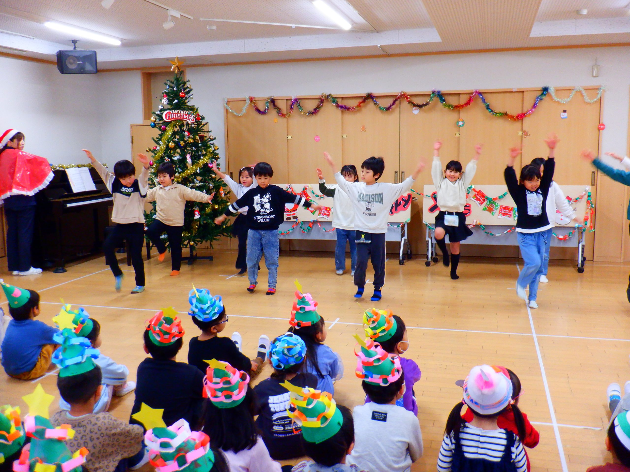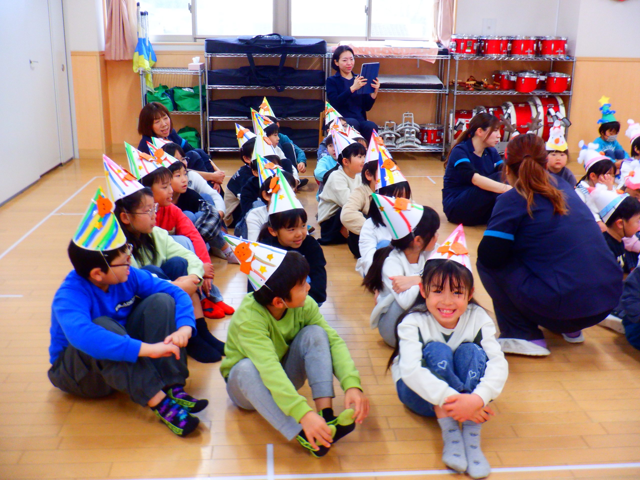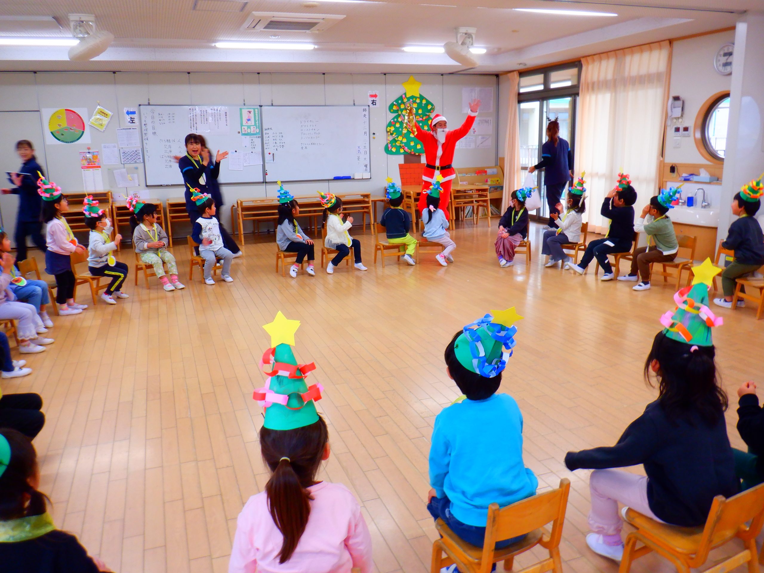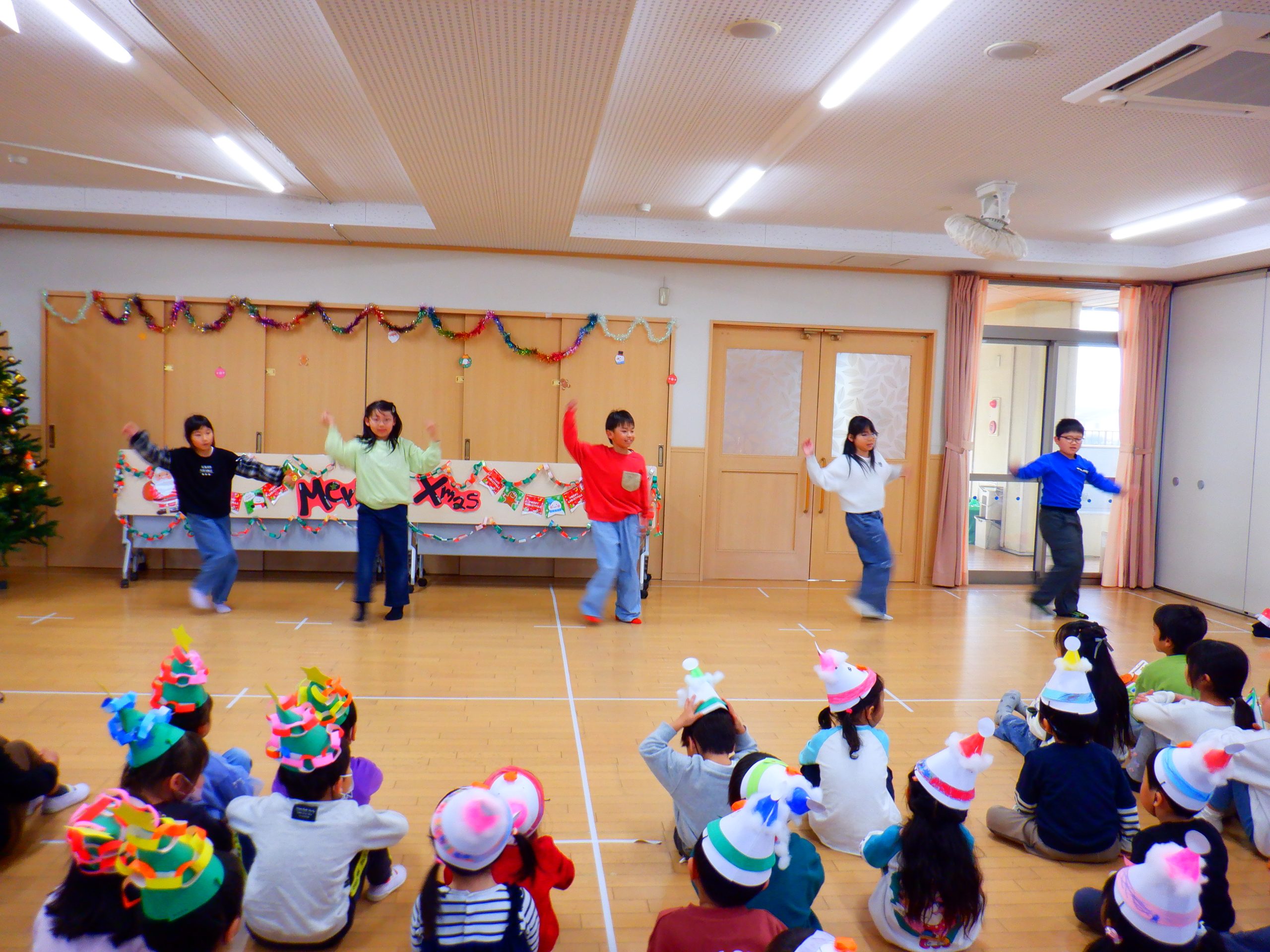 今日は、みんなの楽しみにしていたクリスマス会を行いました。学童さんのダンスや先生のハンドベルなど楽しい催し物の後は、サンタさんからプレゼントをもらいました。